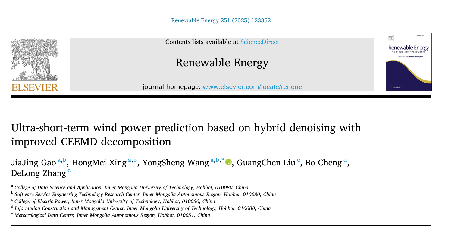 该研究成果受到国家自然科学基金(No. 62366039)、内蒙古自治区科技项目(No. 2023YFSH0066)及内蒙古高校科研项目(No. JMZD202301)资助。相关成果以“Ultra-short-term wind power prediction based on hybrid denoising with improved CEEMD decomposition”为题在国际期刊Renewable Energy上发表。球王会2023级硕士研究生高嘉婧为该论文第一作者,数据科学与应用学院王永生教授为该论文通讯作者,球王会体育官方网站数据科学与应用学院为该论文第一完成单位。