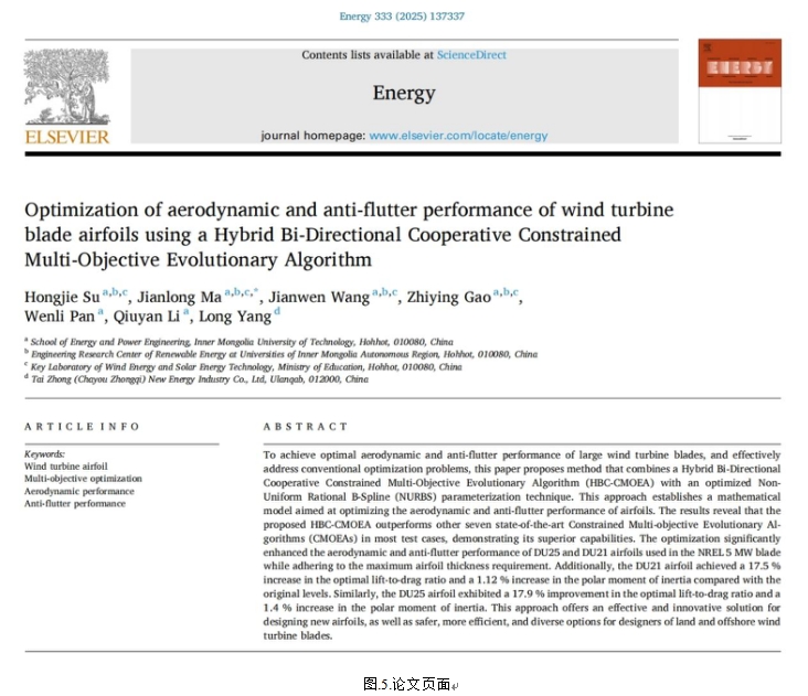 该研究成果受到国家自然科学基金No.52366017No.51966014;内蒙古科技计划项目No.2021GG0436;内蒙古自然科学基金项目No.2023MS05003;内蒙古高校“青年科技英才”项目(No. NJYT23021);内蒙古自治区直属高校基本科研业务费项目No.JY20240059支持。相关研究文章“Optimization of aerodynamic and anti-flutter performance of wind turbine blade airfoils using a Hybrid Bi -Directional Cooperative Constrained Multi-Objective Evolutionary Algorithm”(DOI: https://doi.org/10.1016/j.energy.2025.137337在国际期刊Energy》(中国科学院一区TOP,IF:9.4)发表,马剑龙教授为通讯作者,第一作者为该团队的博士研究生,球王会为论文第一单位和唯一通讯单位。