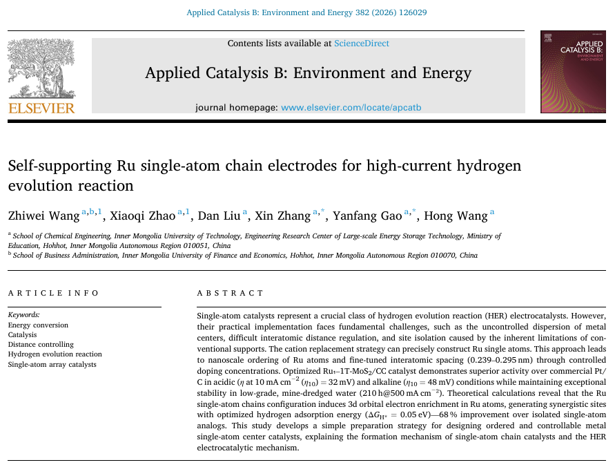 近日,球王会高艳芳教授、张欣副教授团队在国际知名期刊《Applied Catalysis B: Environment and Energy》(中国科学院一区TOP,IF:21.1)上发表了一篇题为“Self-supporting Ru Single-Atom Chain Electrodes for High-Current Hydrogen Evolution Reaction”(DOI: https://doi.org/10.1016/j.apcatb.2025.126029)的研究论文。高艳芳教授、张欣副教授为共同通讯作者,团队中的2020级博士研究生王志伟和2022级博士研究生赵晓琦为共同第一作者,球王会为论文第一通讯单位。