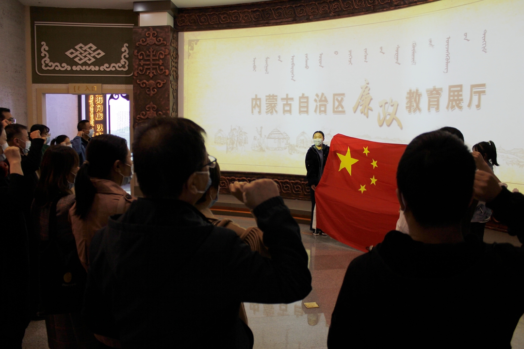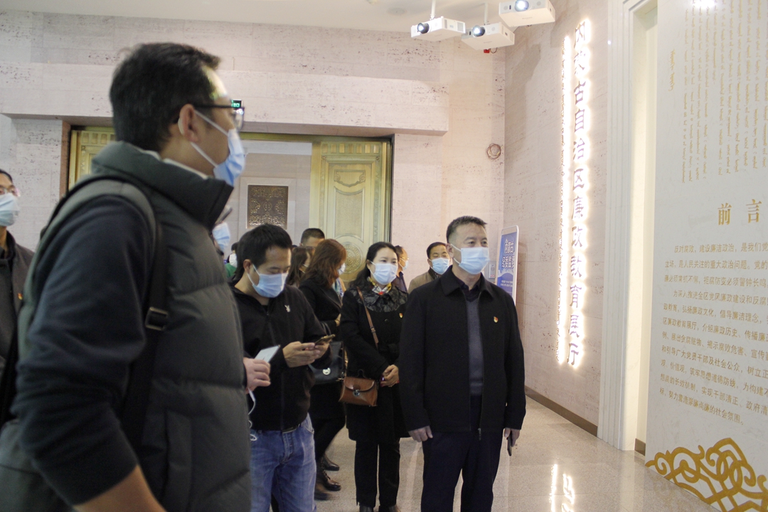 在讲解员的引领下,大家仔细观看了廉政教育展厅的“史海问廉、以古鉴今”“惩腐肃贪、世界纵览”等7个展区。通过大量真实的案例资料和佐证实物,进一步了解了廉政历史、廉政文化、典型案例及贪腐危害等。同时也认真观看了乌兰夫、牛玉儒、都贵玛、廷巴特尔等人物事迹介绍影像播放。通过观展,大家系统全面地回顾了党的反腐历程,以及近年来自治区党风廉政建设和反腐败斗争取得的成效,并通过音视频情景再现等技术,身临其境地感受了腐败带给个人和家庭的巨大伤害。