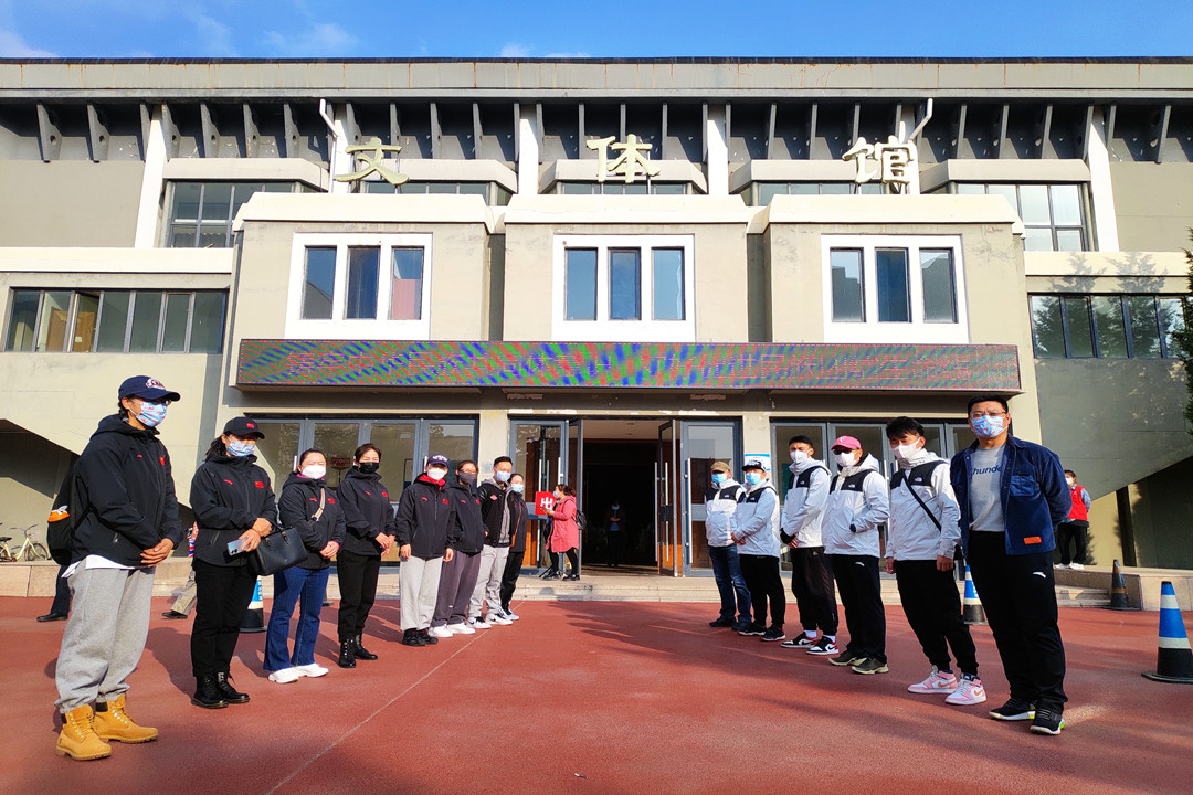 助力——球王会全员核酸检测中,党总支全体党员统一着装、佩戴口罩,在体育馆协助引导全校师生有序排队进行样本采集。