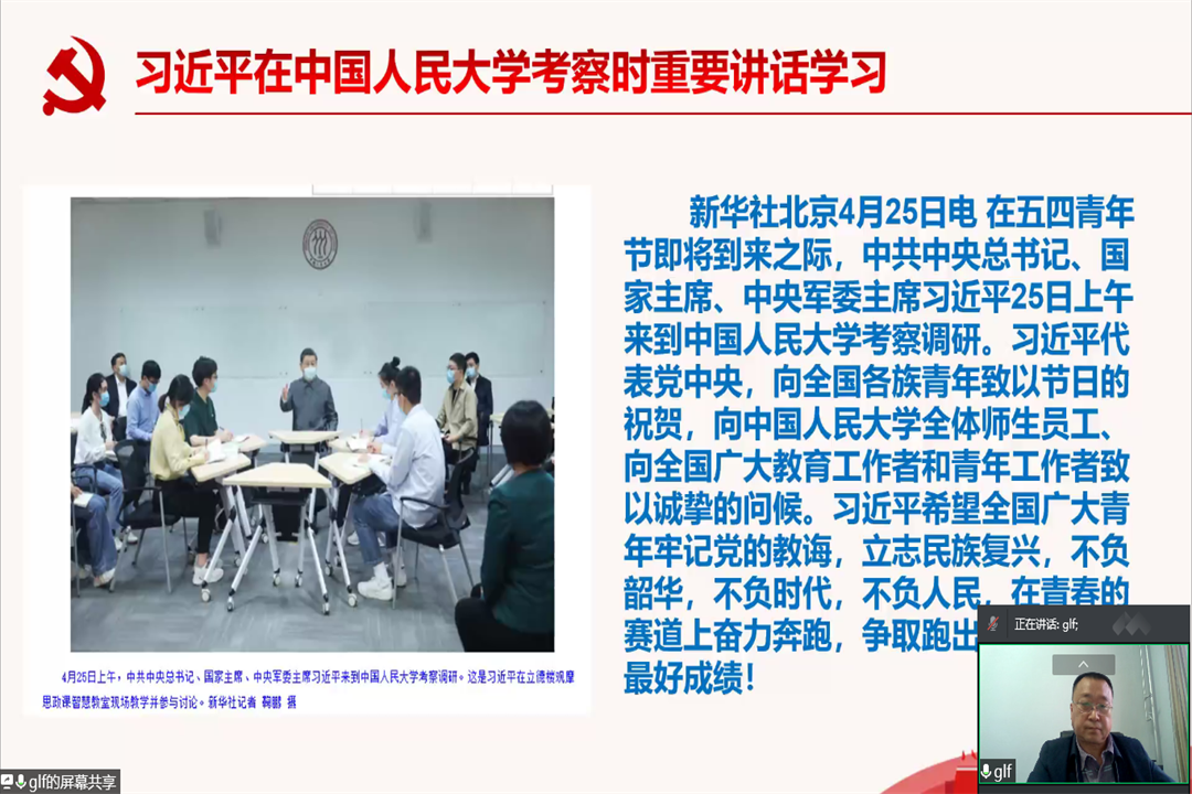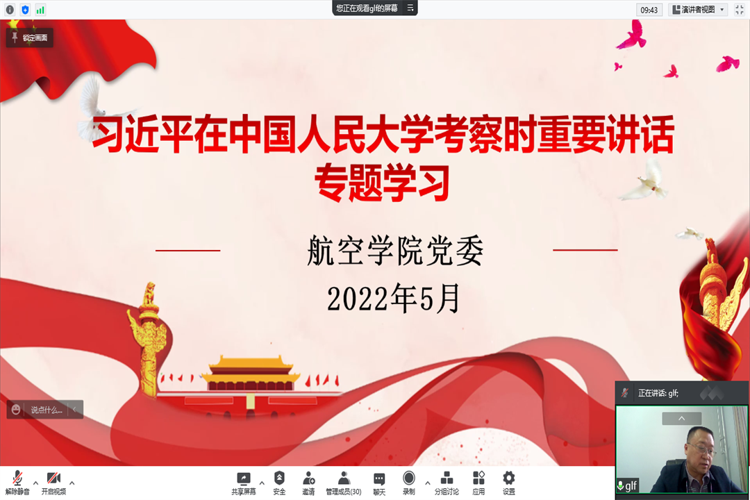 5月5日,航空学院组织开展“习近平总书记在中国人民大学考察时重要讲话”专题学习。航空学院全体教师通过线上方式进行集中学习,学院党委书记郭凌峰主持学习会。