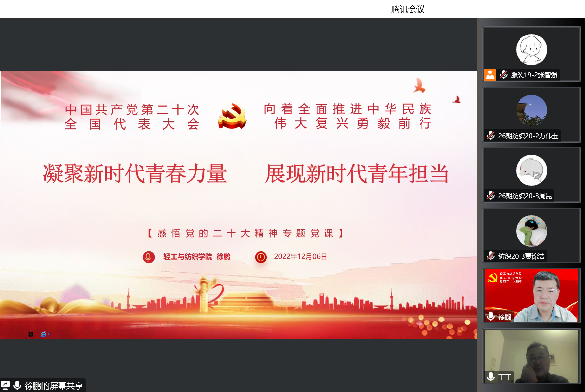 12月6日,轻工与纺织学院党委举行学习贯彻党的二十大精神专题宣讲会第七讲,学院党委委员、副院长徐鹏作题为“凝聚新时代青春力量,展现新时代青年担当”的宣讲报告。学院团学办公室主任丁志明主持报告会,学院全体教职工、学生党员、发展对象和入党积极分子共177人线上聆听报告。