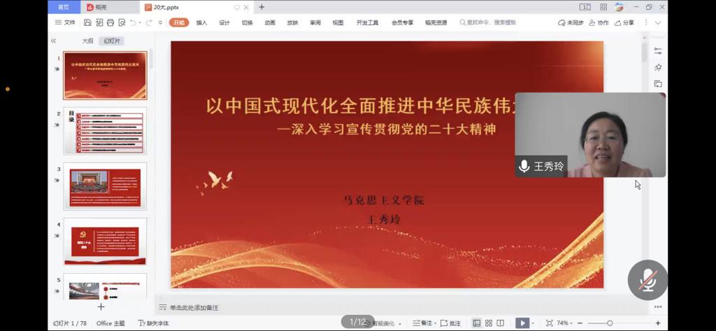 12月8日下午,信息工程学院党委邀请学校党的二十大精神宣讲团成员、马克思主义学院王秀玲教授作专题宣讲。学院党委书记乌迪主持会议,学院全体教师线上学习。