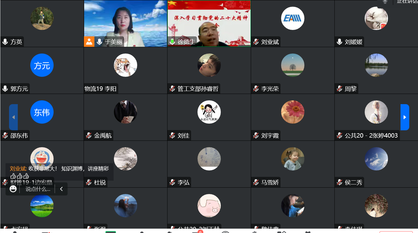 于美丽以深刻把握党的二十大精神的核心要义与实践要求为题,从新时代十年的成就与变革推动中国迈上新征程习近平新时代中国特色社会主义思想的世界观和方法论全面建设社会主义现代化国家的目标任务以党的自我革命引领社会革命的重要要求4个方面进行宣讲,引导学院师生全面、准确、深入领会党的二十大精神的思想精髓与核心要义。