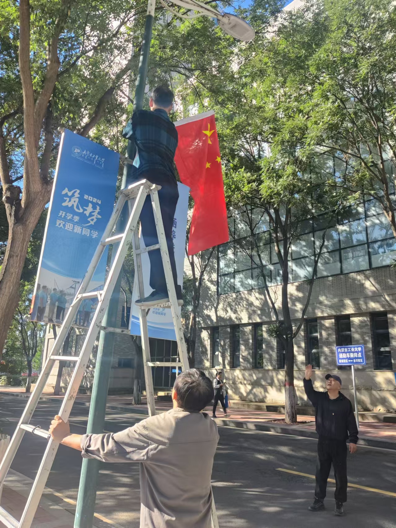 上午9时许,支部党员协同物业人员在校园各条主路悬挂国旗200余面。鲜艳的五星红旗迎风飘扬,与校园秋色相映成景,营造出一片庄严喜庆、文明和谐的节日氛围。