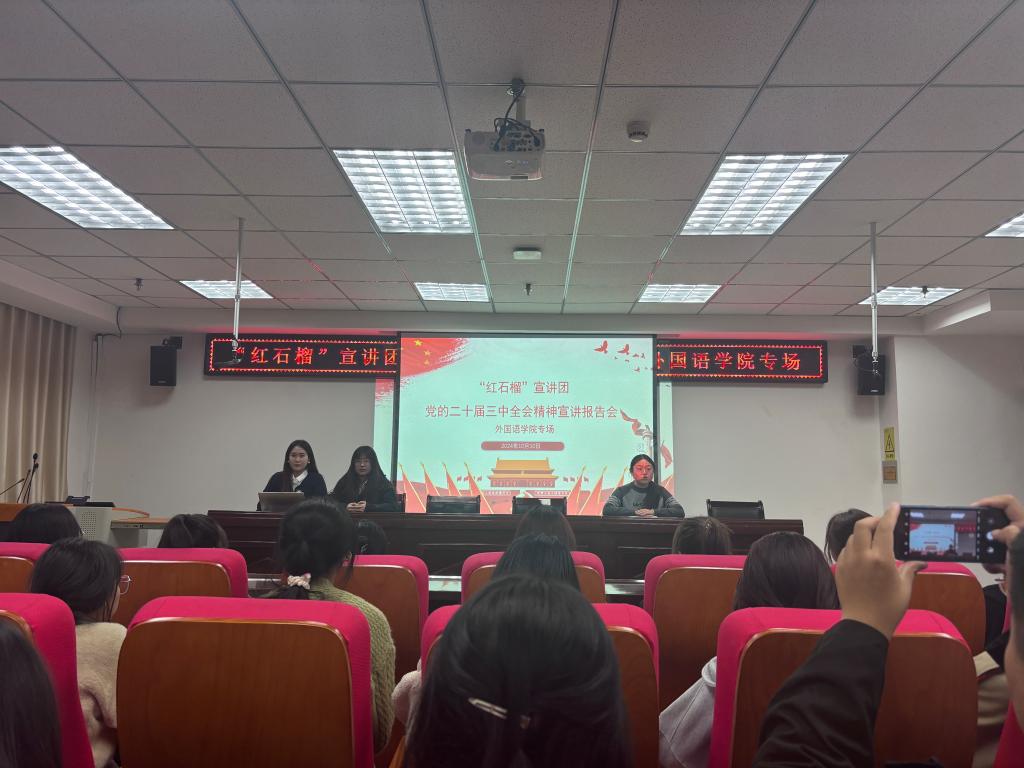 近日外国语学院党委邀请马克思主义学院樊桂清副教授和学校“红石榴”宣讲团成员分别为全体教职工、学生党员和入党积极分子作学习贯彻党的二十届三中全会精神宣讲。