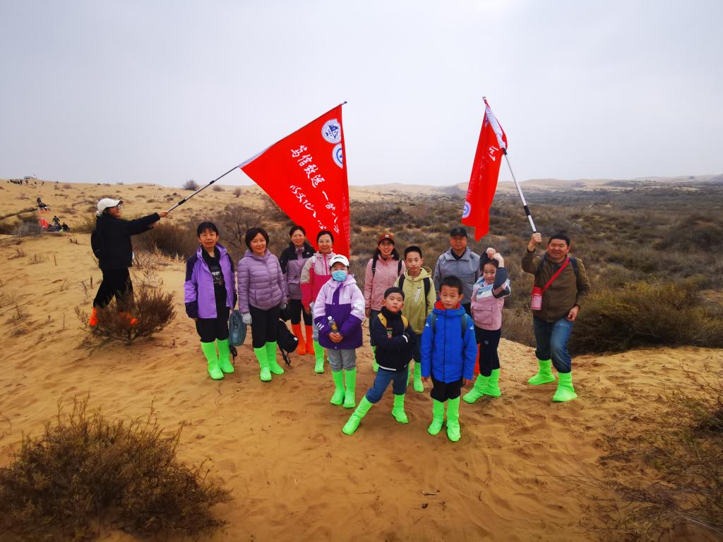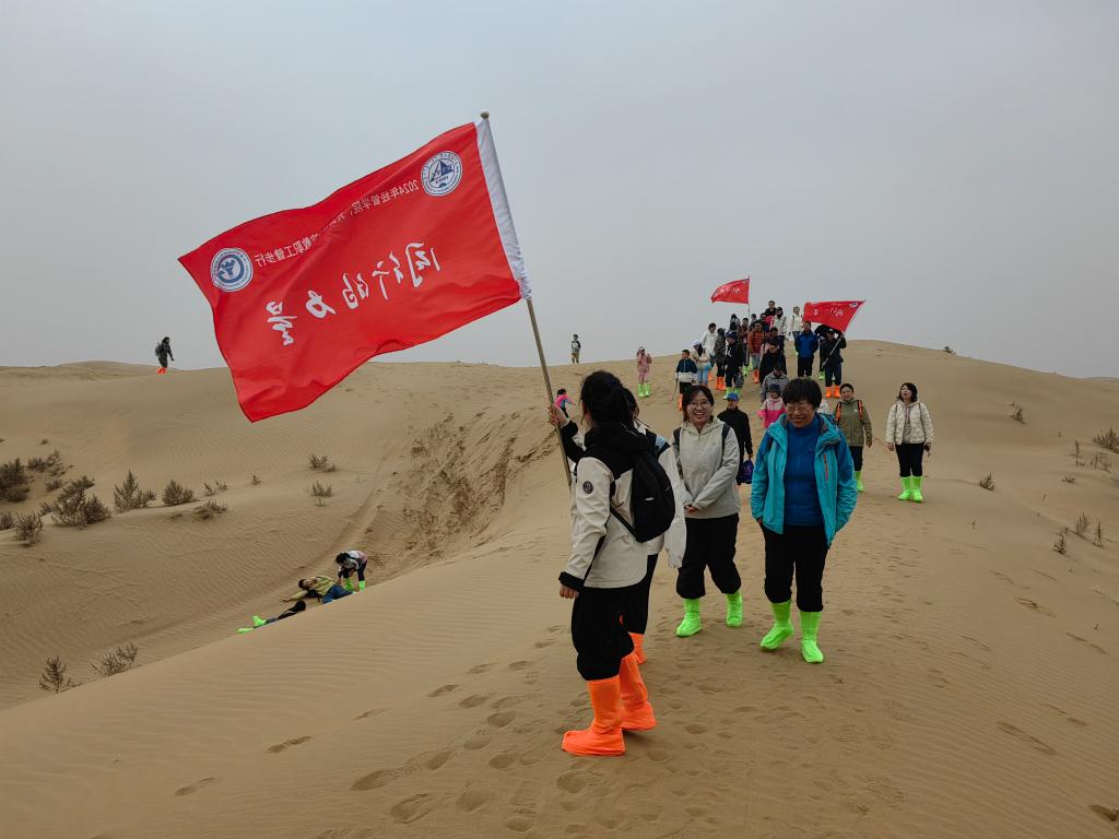 活动期间,师生一行头顶骄阳,脚踏黄沙,徒步穿越沙漠赛道,一路相互鼓劲,携手前行,深切感受库布齐沙漠治沙人数十年如一日植树造林、防沙治沙的奋斗事迹,感悟从“沙进人退”到“绿进沙退”的历史转变,全面认识内蒙古防沙治沙取得的巨大成就。